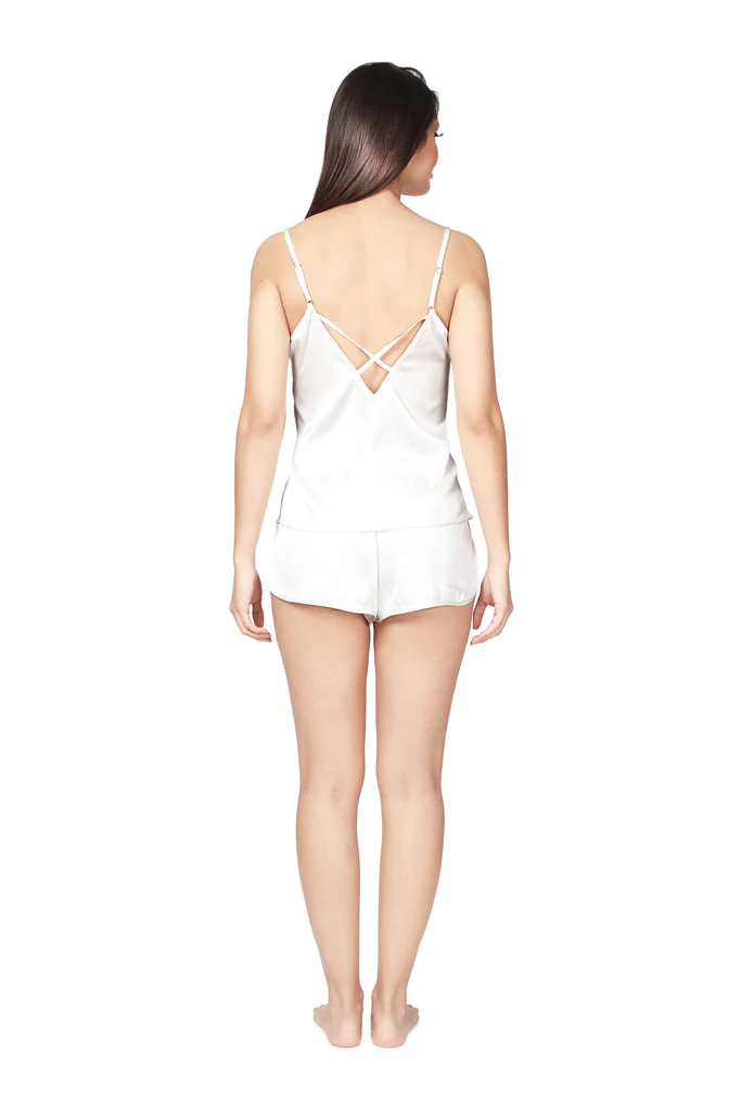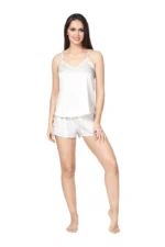 Camiset Whispers Lingerie de 2 piezas: camiseta y short en satin spandex de la más alta calidad, con aplicación de encaje bordado en camiseta y short.